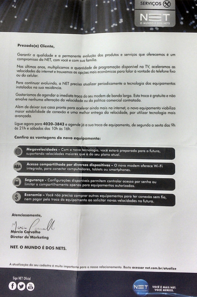 A carta enviada pela NET informa ao cliente que uma mudança no modem da banda larga é necessária e a troca pode ser agendada pelo telefone 4020-3843.