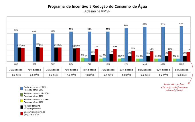 O aumento na adesão ao bônus é consequência da queda no percentual dos usuários que elevaram o consumo: em maio, ele foi de 17%, contra 18% em abril. Desses 17%, 10% tiveram de pagar tarifa de contingência por gastarem mais que a média de consumo de fevereiro de 2013 a janeiro de 2014; os demais 7% elevaram o gasto, mas não foram enquadrados na sobretaxa por consumirem menos de 10 mil litros mensais ou estarem cadastrados na Tarifa Social.