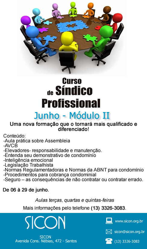 Venha participar do Curso SÍNDICO PROFISSIONAL - MÓDULO II - realizado pelo SINDICATO DOS CONDOMÍNIOS PREDIAIS DO LITORAL PAULISTA - SICON