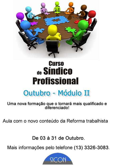 Venha participar do Curso SÍNDICO PROFISSIONAL - MÓDULO II - realizado pelo SINDICATO DOS CONDOMÍNIOS PREDIAIS DO LITORAL PAULISTA - SICON