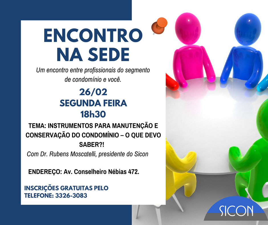O Encontro na Sede de Fevereiro é: Instrumentos para manutenção e conservação do condomínio - O que devo saber?! .... (**antes que o pior aconteça.)